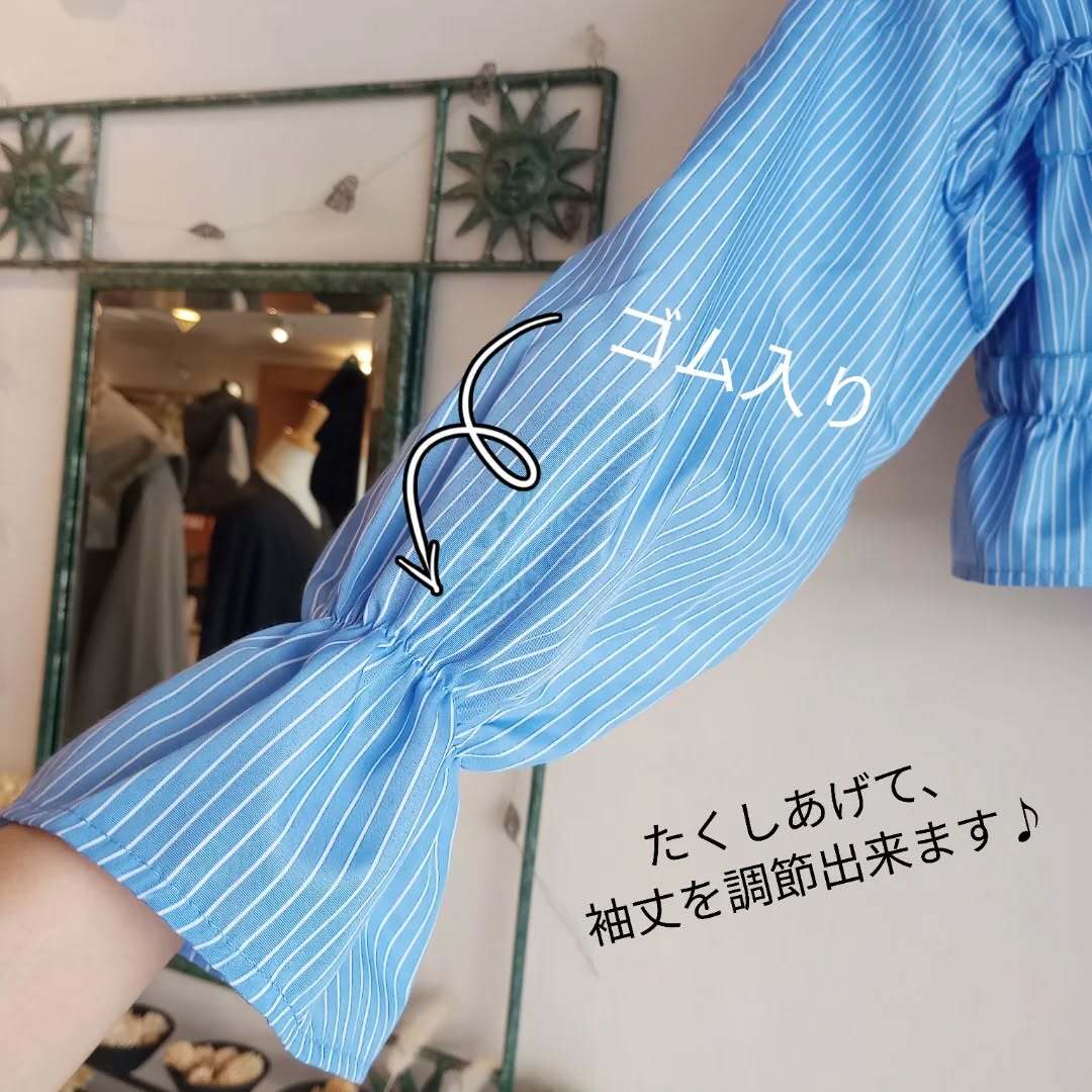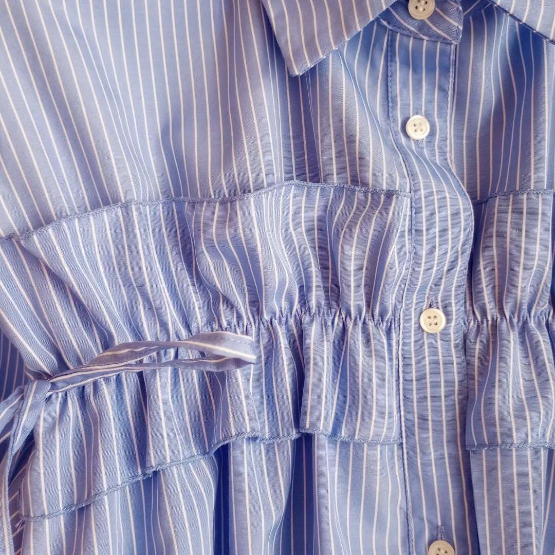 フリルとリボンの甘いディテールと、ストライブのクールなテイストとのバランスが、おしゃれなブラウスです。